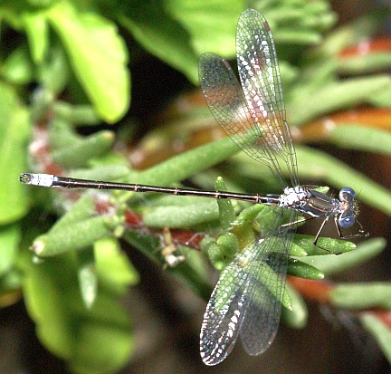 Other:  The Spotted Spreadwing is named for the two dark spots just behind its rear leg on the bottom of its thorax.  The upper part of the thorax and abdomen is typically dark brown to black with the lower part of the thorax being pale. It is a salt tolerant species that is found thoughout the prairie and grassland regions of Alberta. As it is somewhat cold tolerant it is the last spreadwing seen in the fall with some individuals surviving into October. (Acorn, 2004 & Cannings, 2002)